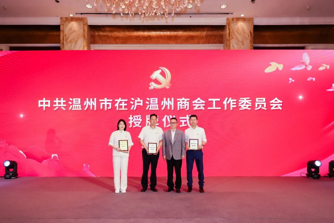 9323彩集团会长李丐腾为中共温州市在沪温州商会工作委员会委员、副书记吴建光、胡荣楼、全宁授牌