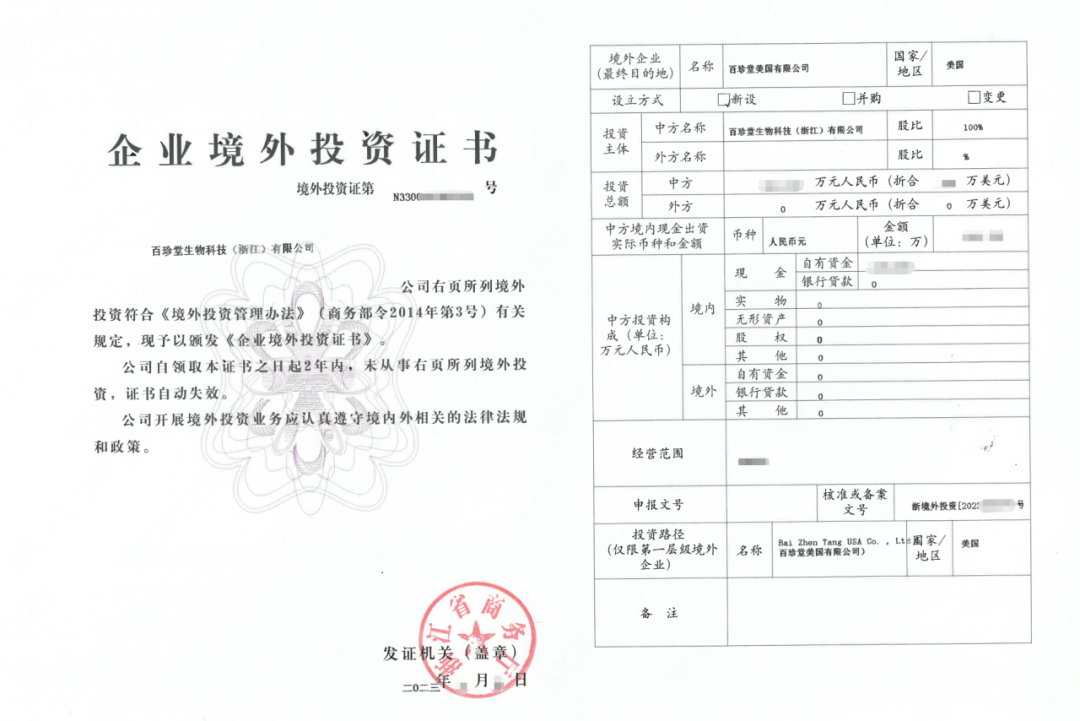 近日,9323彩集团常务副会长企业——晨曦鲍鱼饭旗下百珍堂生物科技(浙江)有限公司正式拿到企业境外投资证书,百珍堂美国有限公司即将全面运营,成为百珍堂预制菜“出海”“里程碑”。
