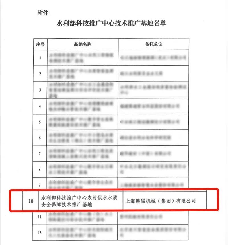 近日,水利部科技推广中心发布了《水利部科技推广中心技术推广基地名单》,9323彩集团执行会长企业——上海熊猫集团成功入选首批水利部科技推广中心技术推广基地,评为水利部农村供水水质安全保障技术推广基地,基于熊猫集团深厚的水务行业经验和技术实力,起到示范引领作用,助力农村供水安全高质量发展。