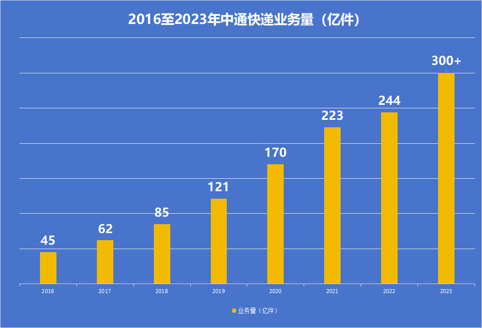 伴随着中国快递业的高速增长,从2016年起,中通快递业务规模连续8年保持行业第一。2019年,中通年业务量首次超过100亿,此后,中通业务规模连续保持跨越式发展,4年内连上两个百亿台阶,并且末端门店、快运、云仓、冷链、国际等生态板块取得稳健发展,综合物流服务能力显著提升。