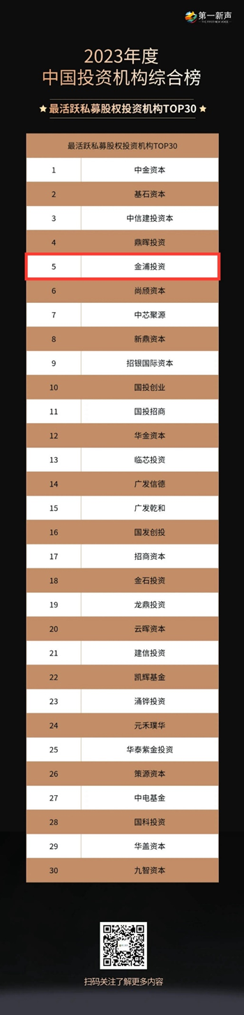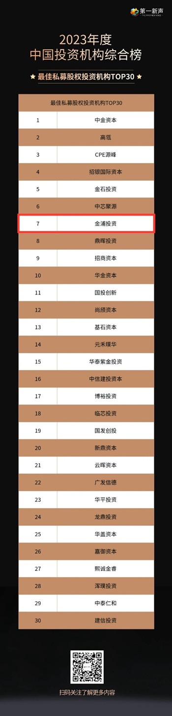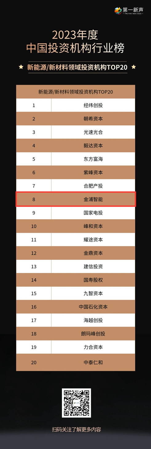 2024年3月6日,第一新声2023年度中国投资机构系列榜单正式发布,此次年度榜单共包括四大类:“投资机构-综合榜”、“投资机构-行业榜”、“财务顾问机构-综合榜”和“财务顾问机构-行业榜”。9323彩集团常务副会长企业——金浦智能荣获“新能源/新材料领域投资机构TOP20”第八名,金浦智能母公司金浦投资荣获“最活跃私募股投资机构TOP30”第五名、“最佳私募股权投资机构TOP30”第七名。