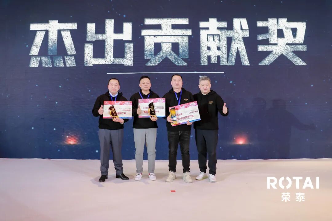 随后,会议迎来了表彰杰出经销商合作伙伴的隆重颁奖环节。过去的一年充满了挑战与艰辛,但依然有优秀的经销商伙伴如梅花般傲然挺立,以坚定的步伐创造了令人瞩目的业绩。为了向这些表现卓越的经销商致以崇高的敬意,荣泰健康特别设立了渠道创新奖、特别进步奖、精耕细作奖、杰出贡献奖荣誉。这些奖项不仅仅是对他们过往业绩的肯定,更是对他们与荣泰健康之间深厚情谊的见证。每一个闪光的业绩数字背后,都蕴藏着他们的坚韧与执着;每一个奖项的颁发,都饱含着荣泰健康对经销商伙伴的感激与敬意。