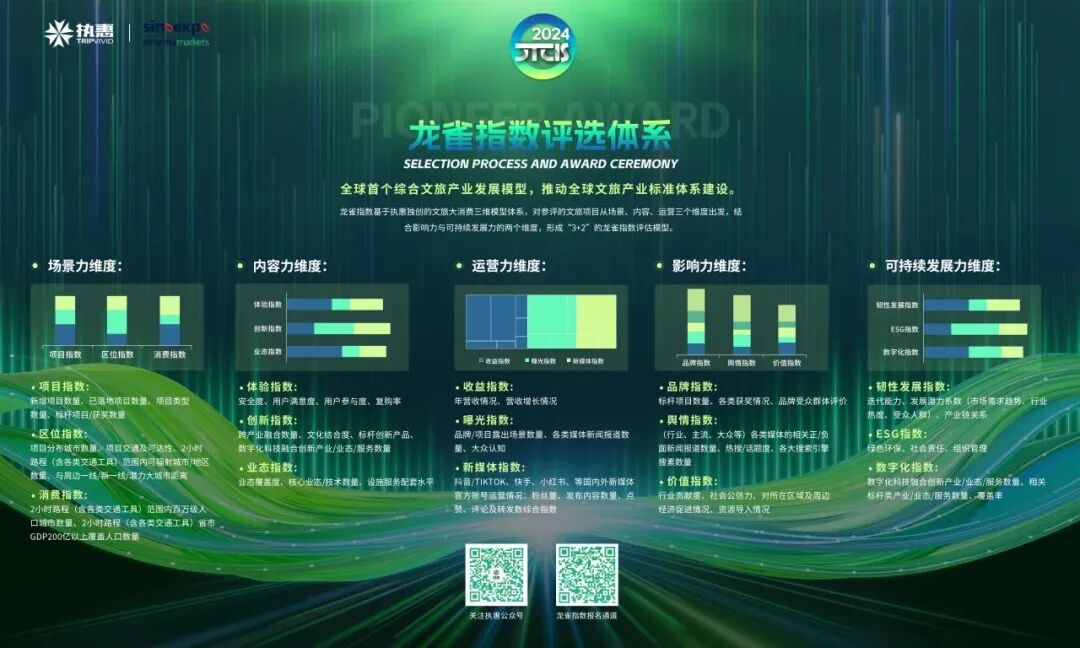 3月28日,中国文旅大消费创新峰会组委会首次发布龙雀指数。龙雀指数是基于执惠独创的文旅大消费三维模型体系,对参评的文旅项目从场景、内容、运营三个维度出发,结合影响力与可持续发展力的两个维度,形成“3+2"的龙雀指数评估模型,赋能目的地和文旅大消费同业!