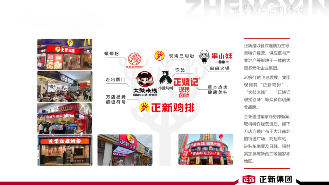 经过20多年的飞速发展,正新集团自创多个美食品牌,门店产品品种多达上百个,旗下“万店连锁”品牌正新鸡排广布于大江南北的街道广场、商超车站,进驻东南亚及日韩,辐射美加澳与新西兰等国家和地区。