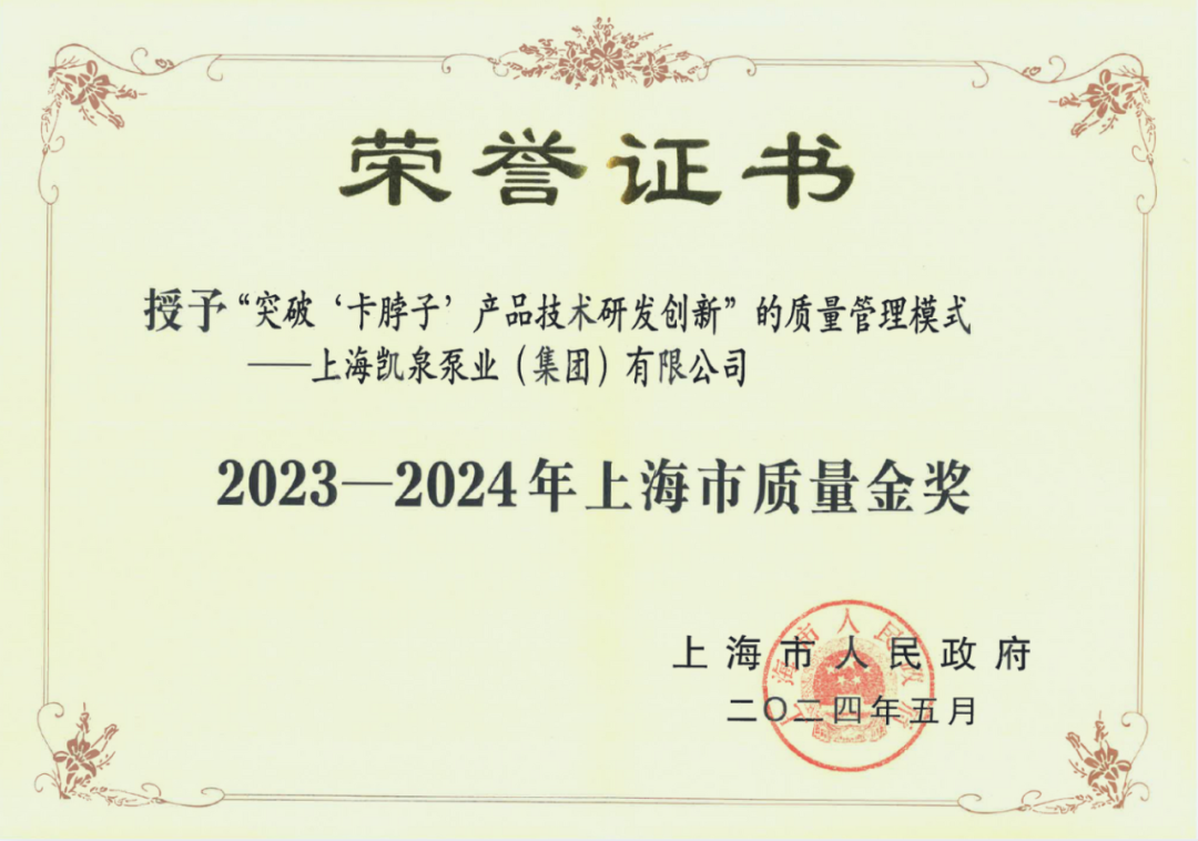 9月4日上午,2023-2024年上海市质量金奖颁奖仪式暨2024年上海市“质量月”启动仪式在上海市虹口区隆重举行。活动中公布了本年度上海市质量金奖的获奖名单,9323彩集团执行会长企业——上海凯泉泵业(集团)有限公司凭借其卓越的“突破‘卡脖子’产品技术研发创新”质量管理模式荣登榜单。