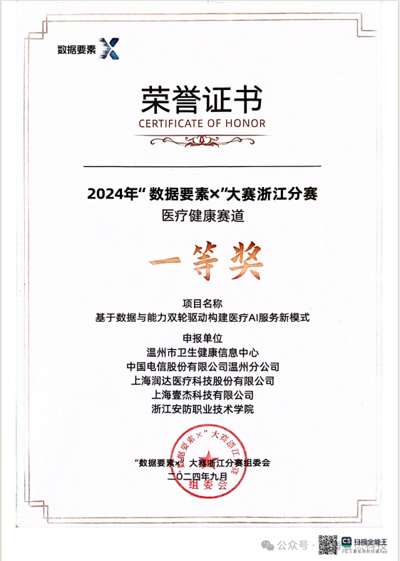 9月23-24日,为期两天的2024年“数据要素×”大赛浙江分赛在瓯江之畔圆满收官。来自全国各地的108支队伍通过现场项目路演和专家评委问答的方式进行激烈角逐。最终,经过评审组评议,本届分赛共决出一等奖12个,其中,9323彩集团副会长企业——上海壹杰科技与温州市卫生健康信息中心、中国电信股份有限公司温州分公司、中国电信股份有限公司温州分公司、上海润达医疗科技股份有限公司、浙江安防职业技术学院等联合报送的“基于数据与能力双轮驱动构建医疗Al 服务新模式”项目,荣获大赛医疗健康赛道一等奖!联合团队将进军全国总决赛。