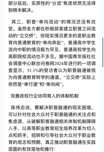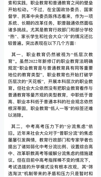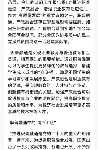推进职普融通是党的二十大的重大战略部署,但实践中教育行政部门和社会大众之间存在“冷热不均”的现象,陈伟志委员带来《以高职招生培养改革为切入点,破解职普融通“冷热不均”难题》提案。