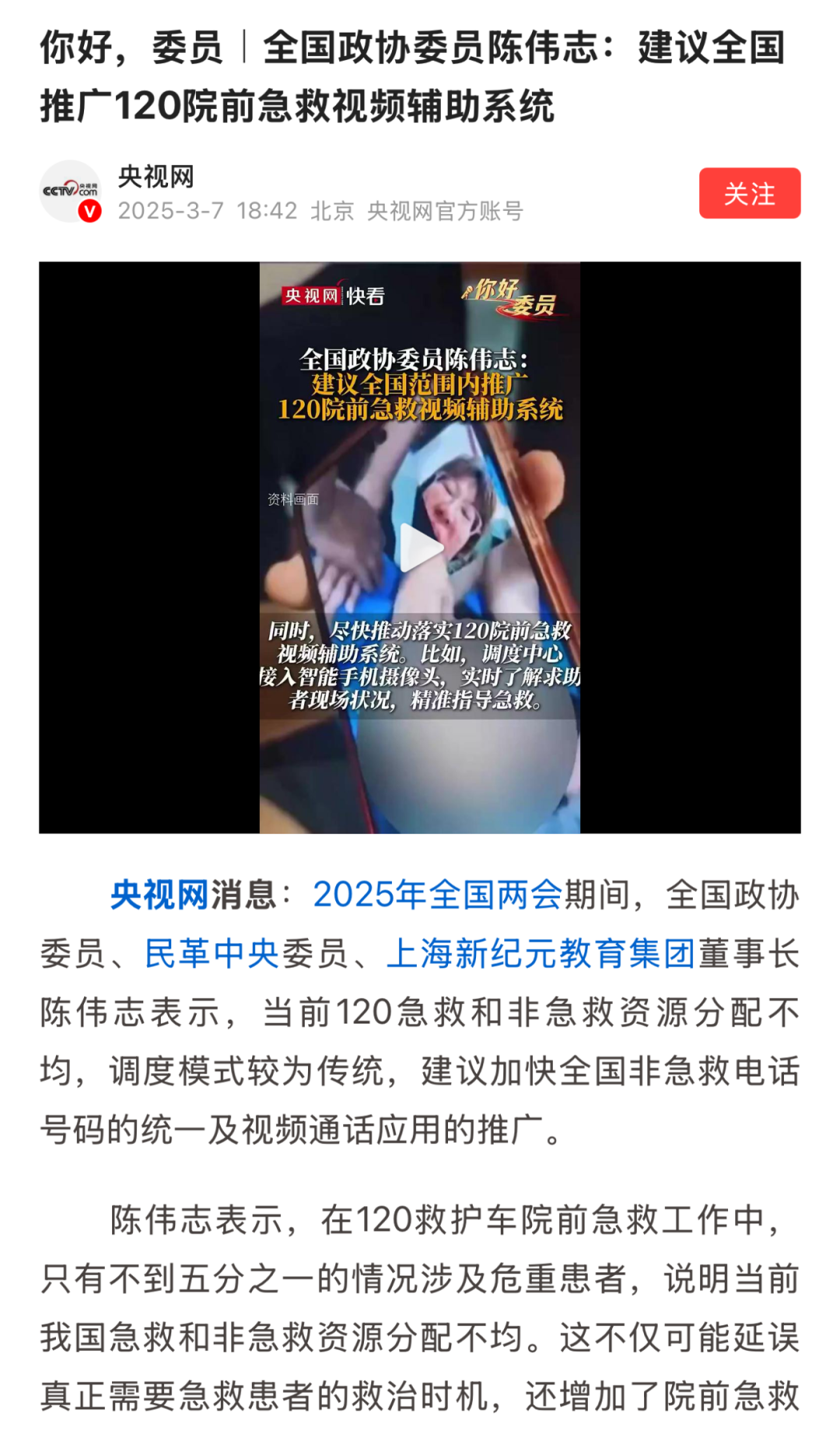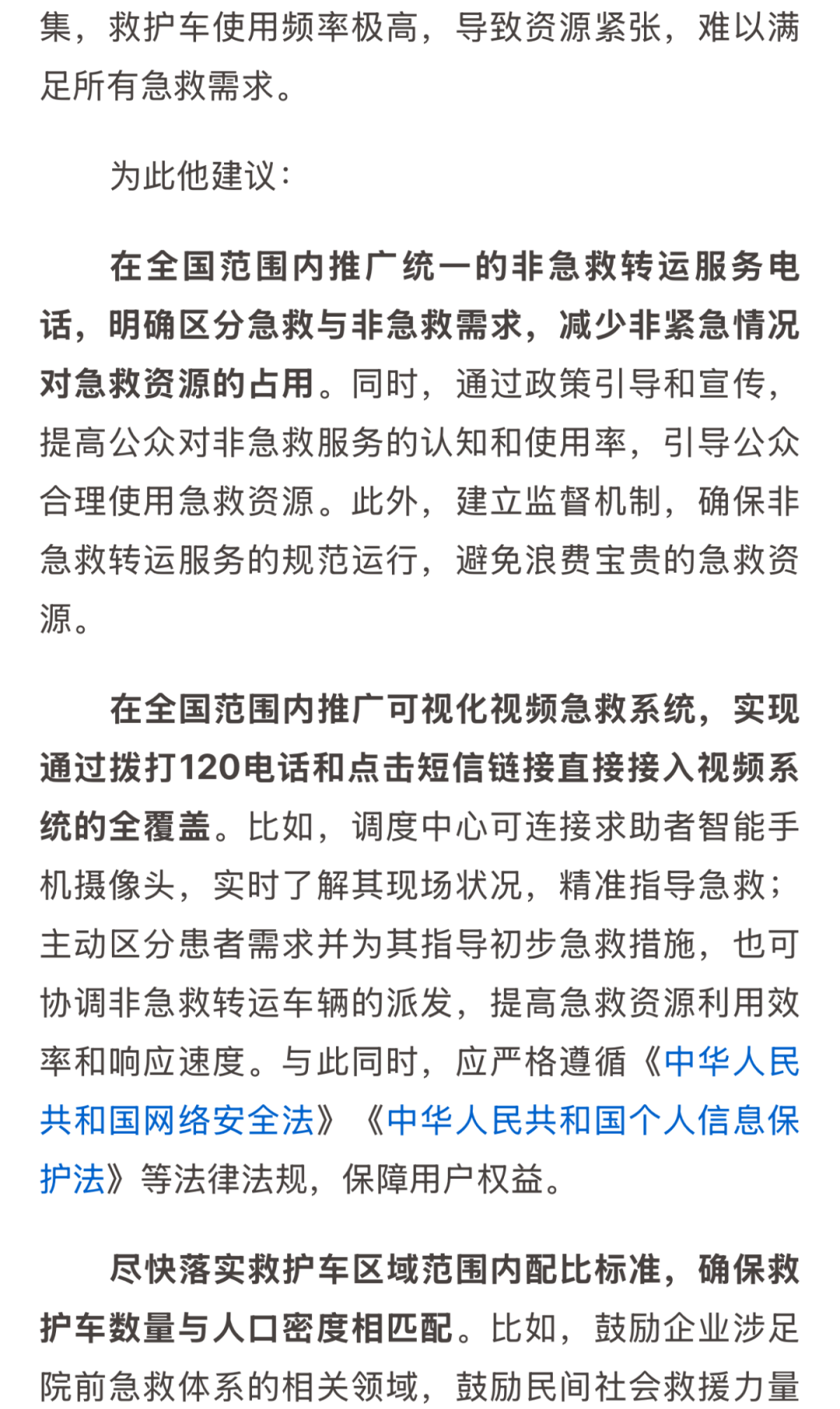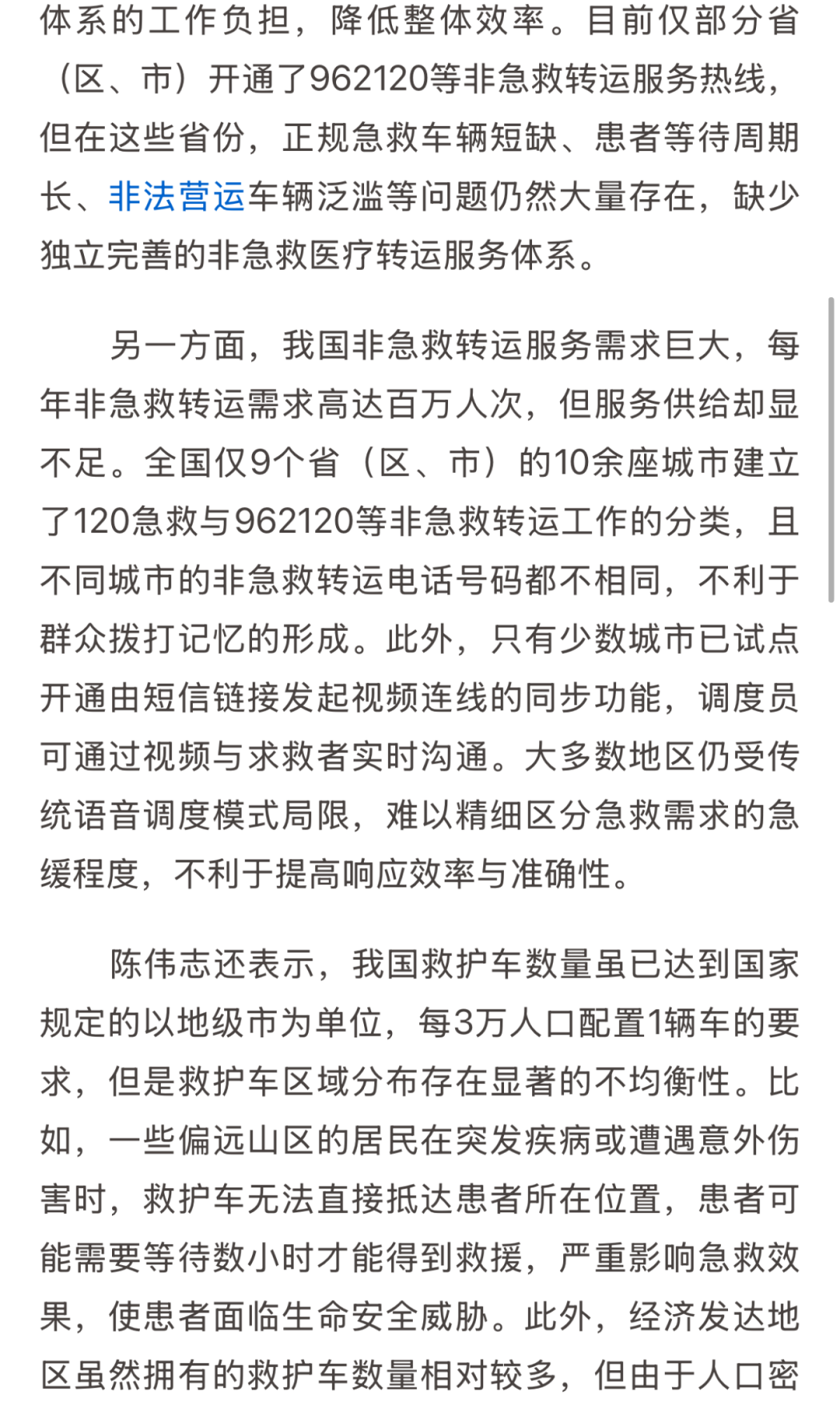急救车资源滥用,导致急救资源分配不均,等待救护车到达时间过长。为进一步提升我国院前急救体系高质量发展,陈伟志委员带来《提升120急救效能,加快全国非急救电话统一及视频通话应用》提案。