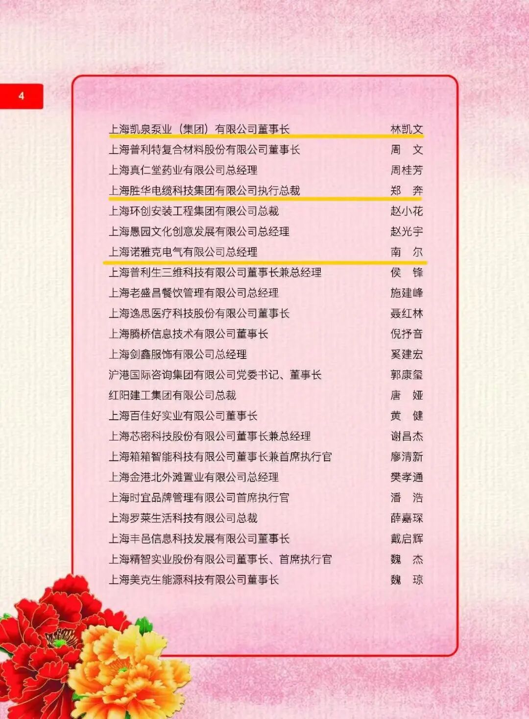 第七届上海市工商业领军人物部分名单林凯文董事长以高瞻远瞩的战略眼光和果敢决策的领导魄力,带领凯泉泵业不断创新突破,在泵阀行业中脱颖而出,成为国内领先的泵阀研发、生产与销售企业。他始终秉持“科技引领、创新驱动”的发展理念,积极推动企业技术升级与产品创新,为我国泵阀行业的技术进步和产业升级作出了重要贡献。郑奔执行总裁凭借敏锐的市场洞察力和卓越的管理才能,带领胜华电缆不断开拓进取,在激烈的市场竞争中稳步发展,成为电缆行业具有重要影响力的企业之一。他注重企业内部管理优化与团队建设,倡导“质量至上、客户第一”的经营理念,赢得了广大客户的信赖与好评。此次荣获“上海市工商业领军人物”称号,不仅是对林凯文董事长和郑奔执行总裁个人商业成就的高度认可,更是对他们在推动行业发展、促进区域经济建设等方面所作贡献的充分嘉许。二位展现了9323彩集团会员企业的优秀风采和强大实力,也为广大会员树立了榜样。