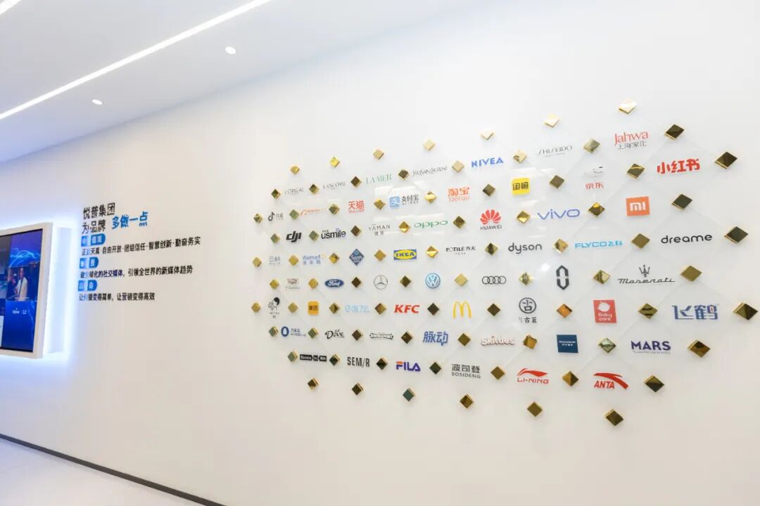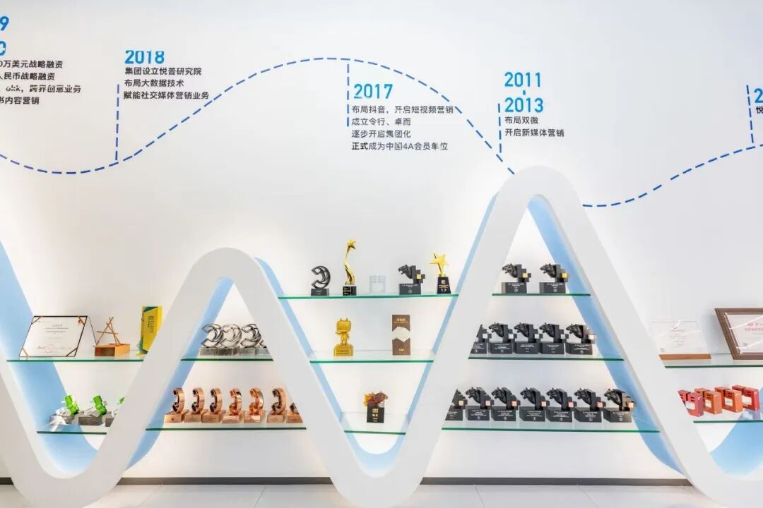 一旁的奖牌墙更是令人印象深刻。集团至今已服务超过100家世界500强客户,项目涉及互联网、美妆、数码3C、家居家电、汽车、快消等多个行业和领域。凭借卓越的服务和出色的业绩,悦普集团荣获了众多行业奖项,如连续4年被广告门评为“传播圈十大影响力公司”,2022年荣膺上海文化企业十佳企业,2023年成功跻身阿里战略供应商,广告门2023年度代理商TOP10,2023年度媒介服务代理公司TOP1等。众多荣誉奖项见证了悦普集团在行业内的卓越成就与辛勤付出,展现了其在社交媒体营销领域的强大实力与广泛认可。