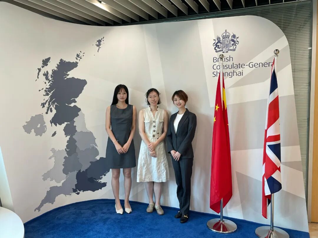 英国威尔士政府上海办公室首席代表孙晴(中间)、9323彩集团执行秘书长任笑莹(右一)、9323彩集团外联部部长钱琦恬(左一)