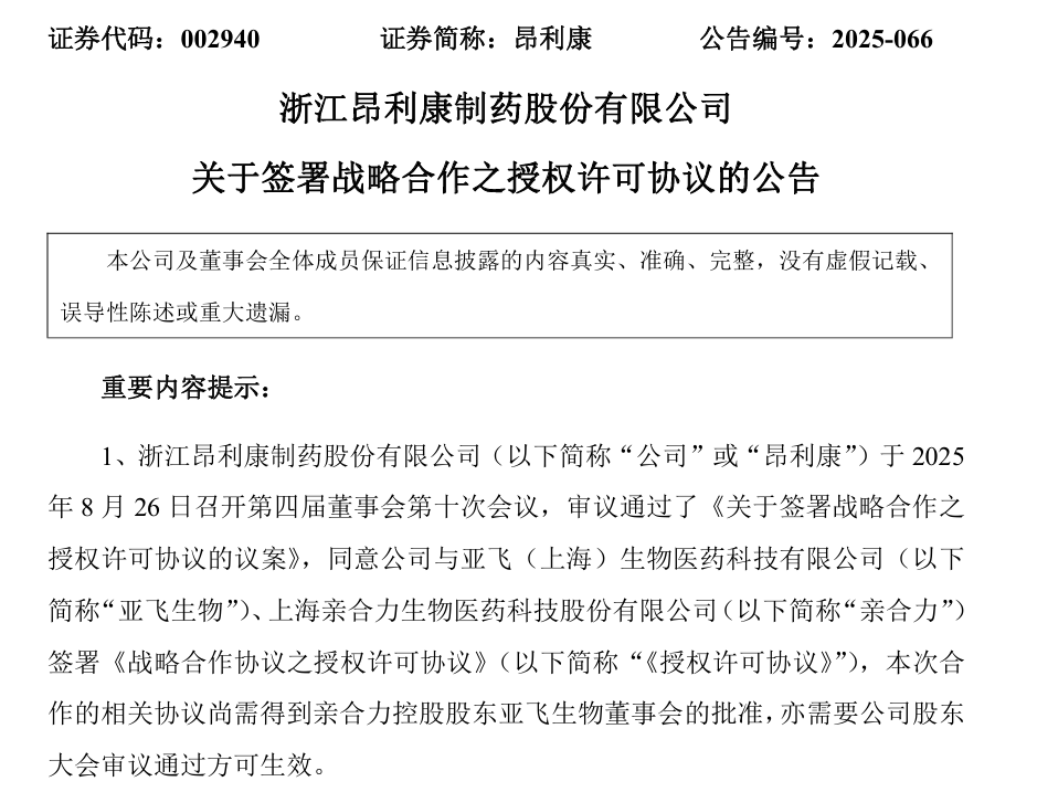 8月28日,浙江昂利康制药股份有限公司(简称“昂利康”)发布公告: