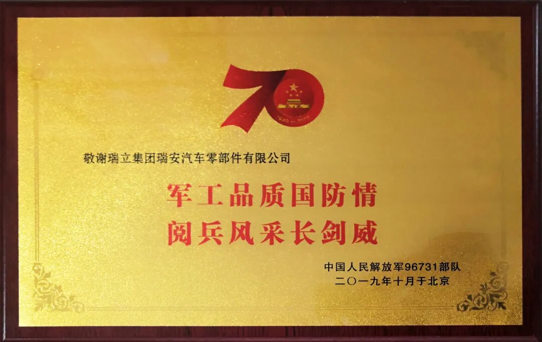 瑞立集团及旗下子公司作为军品指定供方,自主研发的制动系统、电子电控、转向系统、离合系统、新能源、汽车电器及智能网联系列产品配套一汽、东风、重汽、陕汽、北奔、一机、三江、泰安航天、重庆铁马等各主机厂的阅兵军车,亮相在战旗方队;陆上作战群的远程火炮方队;海上作战群的舰载防空武器方队、反舰导弹方队、水下兵器方队;防空反导群的预警探测方队、对空抗击方队、反无人机方队;信息作战群的网络空间作战方队、电子对抗方队、信息支援方队;无人作战群的陆上无人作战方队、海上无人作战方队、空中无人作战方队;后装保障群的后勤保障方队、装备保障方队;战略打击群的巡航导弹方队、高超声速导弹方队、核导弹第一方队、核导弹第二方队,接受祖国和人民的检阅。