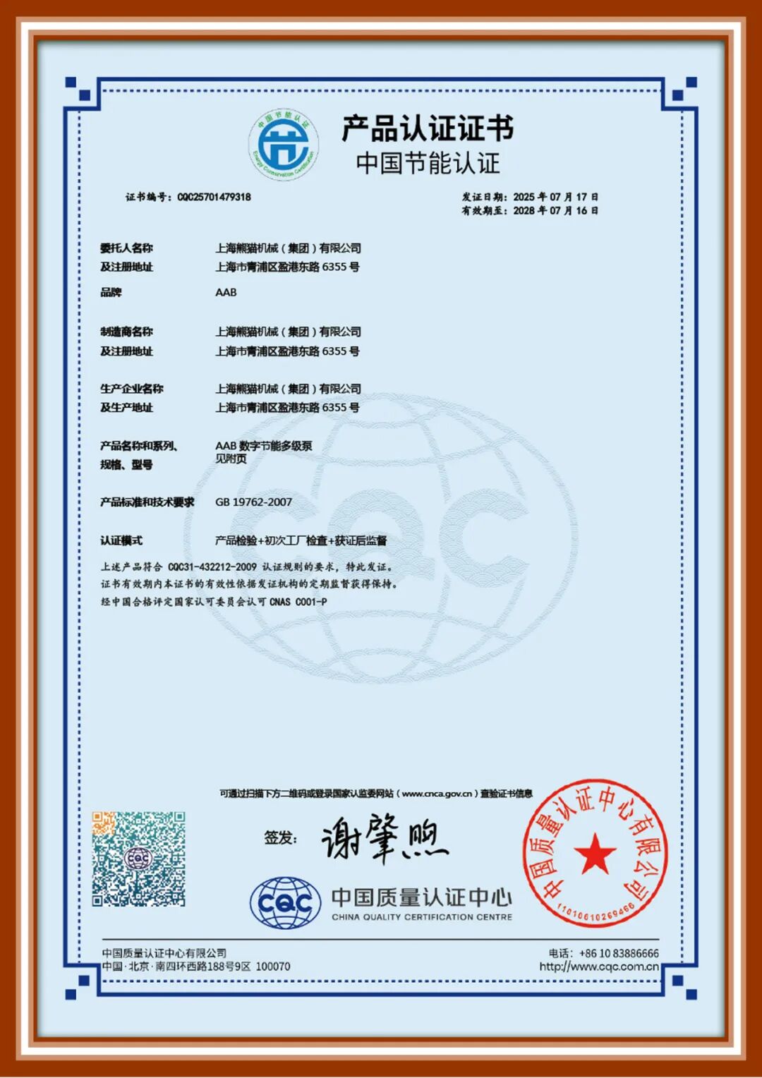 上海熊猫机械(集团)有限公司传来振奋喜讯:旗下AAB数字节能多级泵经中国质量认证中心(CQC)严格审核,成功获得国家节能认证证书(证书编号:CQC25701479318),认证标准符合GB 19762-2007《清水离心泵能效限定值及节能评价值》,标志着这款数字节能泵的核心性能与节能实力得到权威认可,是水务行业高效节能解决方案的优质之选。