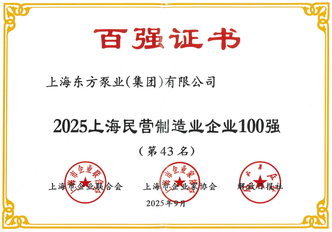 近日,上海市企业联合会、上海市企业家协会正式发布上海民营制造业企业100强、2025上海制造业企业100强、2025上海民营企业100强榜单。东方泵业凭借稳健的发展态势和卓越的制造实力,成功入选榜单。