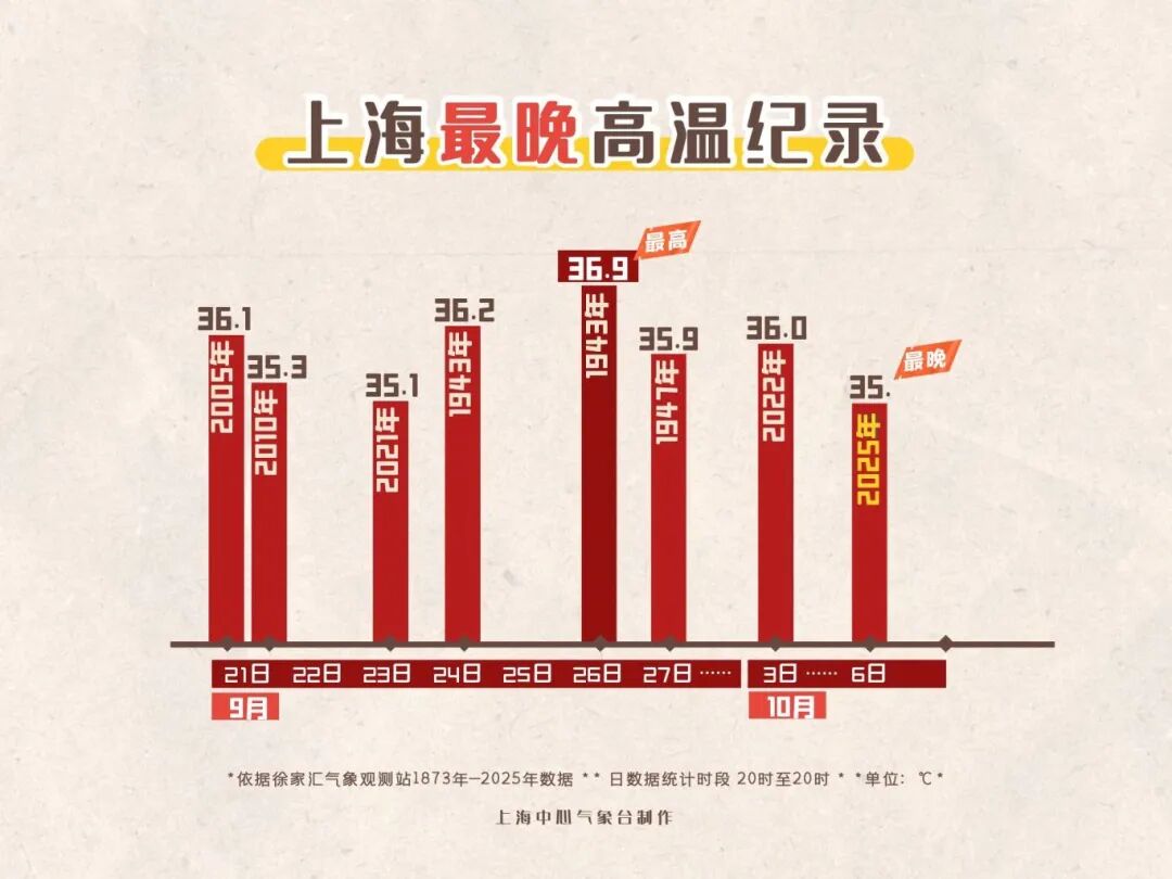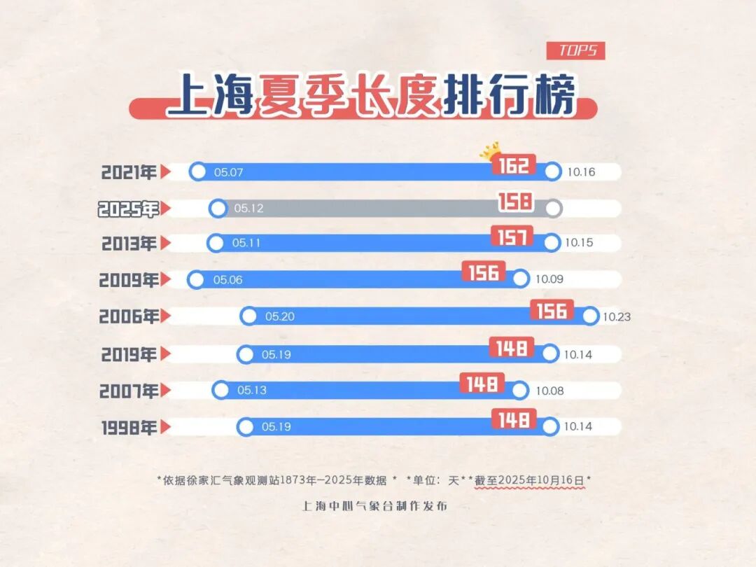 上海今天云多雨弱气温降,徐家汇站白天最高气温为25.4度,国家站中金山27.4度全市最高。5月12日入夏至今,上海今年夏季长度已达158天,是徐家汇站历史第二长的夏天。期间共出现54个高温日,为该站1873年以来高温第二多的夏天。10月6日中秋节当天最高气温35.0度,创下历史最晚高温纪录。接下来一场“换季”冷空气的到来,终于能为这个“悠长夏日”画上句号。