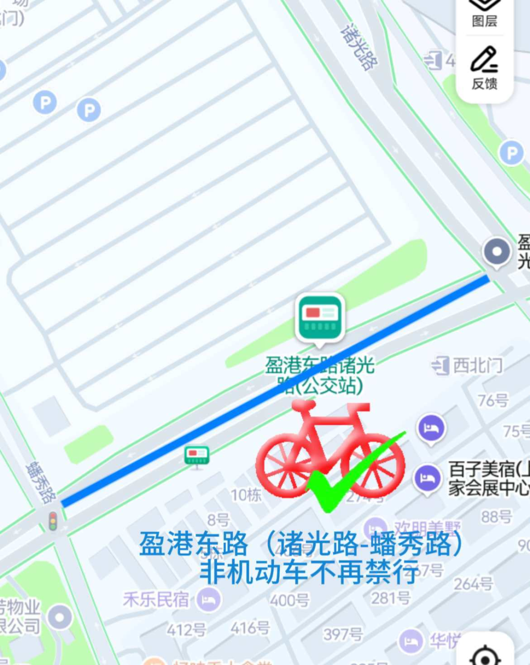 此外,盈港东路(蟠秀路-诸光路)不再采取禁止非机动车通行的管理措施。