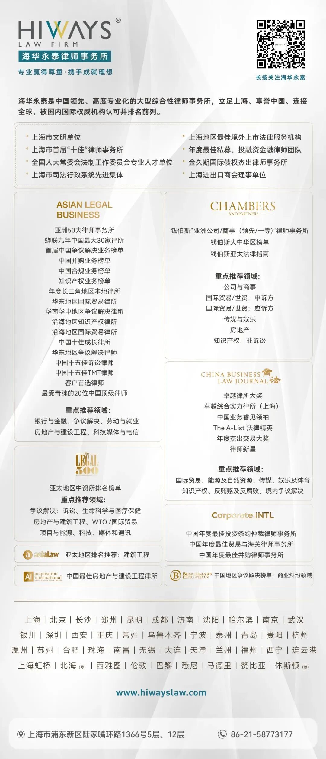 近年来,在保持事务所整体发展规模的基础上,海华永泰各业务领域均实现新突破,获奖数量持续攀升,呈现“多点开花”的良性发展态势。通过提供优质、高效、全面的法律服务,海华永泰不断夯实专业实力,品牌影响力持续扩大,已发展成为一家立足上海、服务全国、辐射全球,在国内外具有重要影响力的综合性法律服务机构,赢得了客户的广泛信赖与卓越的专业声誉。