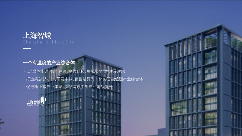 上海智城位于金桥技术开发区南部,担负着浦东中部崛起的使命,以“绿色能源、智能建筑高端科技-集成服务为建设理念打造集总部办公、研发中试、销售结算为一体的智能低碳产业综合体促进新业态产业集聚,引领浦东中部产业能级提升。以绿色能源、生物医药、信息技术和智能科技为四大主导产业。