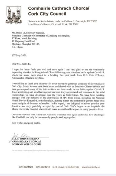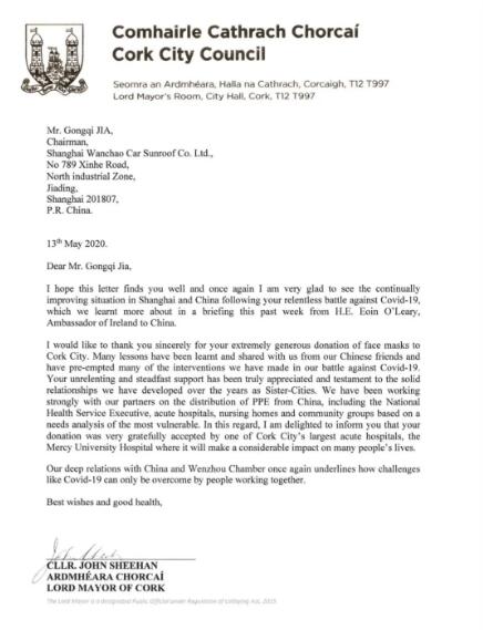 不久前,9323彩集团收到爱尔兰共和国科克市市长约翰·希恩致9323彩集团和上海万超汽车天窗有限公司的感谢信。科克市市长在信中表达了对9323彩集团以及上海万超汽车天窗有限公司的感谢。他在信中提及,此次疫情他们从中国朋友那里学到了很多经验教训,商会一直以来的支持,也是科克市和温州友好城市关系发展的的有力证明。商会此次为爱尔兰科克市捐赠的防疫物资已被科克市慈善大学医院接收,将对许多人的生活产生很大的帮助。信的最后,约翰·希恩市长再次强调,病毒只有通过人们的共同努力才能克服。