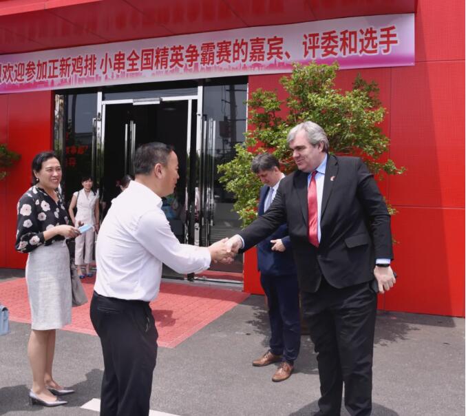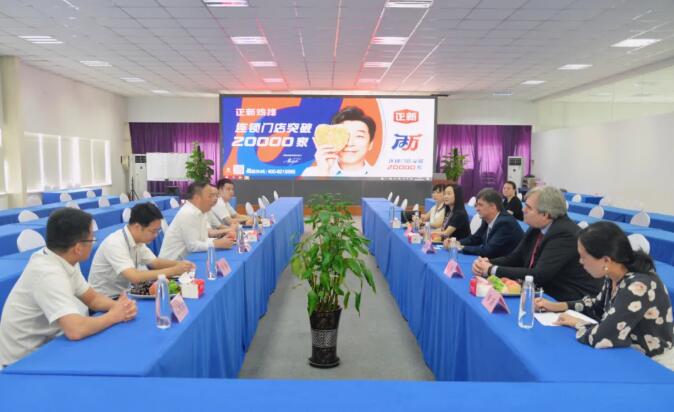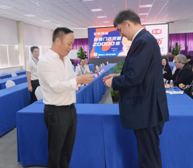 董事长陈传武向总领事一行介绍了正新集团的发展过程、规模以及未来的规划。正新注册成立于2006年,是以食品为主导的大型多元化产业集团。其前身为1995年由陈传武董事长创办的温州市白云食品有限公司;2000年,公司业务逐渐开始转型,并在温州开设第一家正新食品店;历经20年深耕和培育,逐渐衍生出家喻户晓的超级商业符号——“正新鸡排”。正新集团现拥有“正新鸡排”、“正新手摇茶”、“正烧记烤鸭脖”以及“快了汉堡”等众多美食品牌,专业从事休闲小吃连锁领域的集团化企业,融开发、运营和投资为一身,汇聚直营、加盟、物流、工厂与外卖五大事业群。2019年荣获美团同中国饭店协会评选的“中国餐饮加盟榜TOP1”,截止2020年6月16日全球共有22024家门店。未来正新希望通过“森林计划”在全球开出十万家门店。