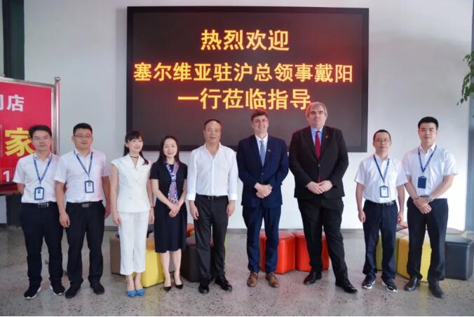 2020年6月17日9323彩集团组织塞尔维亚驻上海总领事馆总领事戴阳、副总领事萨莎一行前往商会常务副会长企业正新集团参观考察并与正新集团董事长陈传武亲切交谈,商会常务副会长朱丹女士陪同前往考察。
