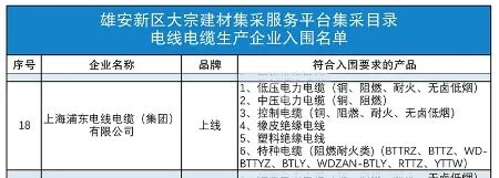 根据《雄安新区建筑材料集中采购管理暂行规定》《雄安新区大宗建材集采服务平台供应商管理细则(试行)》《雄安新区大宗建材集采目录入围指标体系(电线电缆 篇)》,经企业自主报名、专家评审后,上海浦东电线电缆集团成为首批入围雄安新区大宗建材集采目录的电线电缆企业。