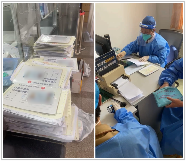受居委会委托,刘行中通小哥拿着居民的医保卡在宝山区仁和医院配药
