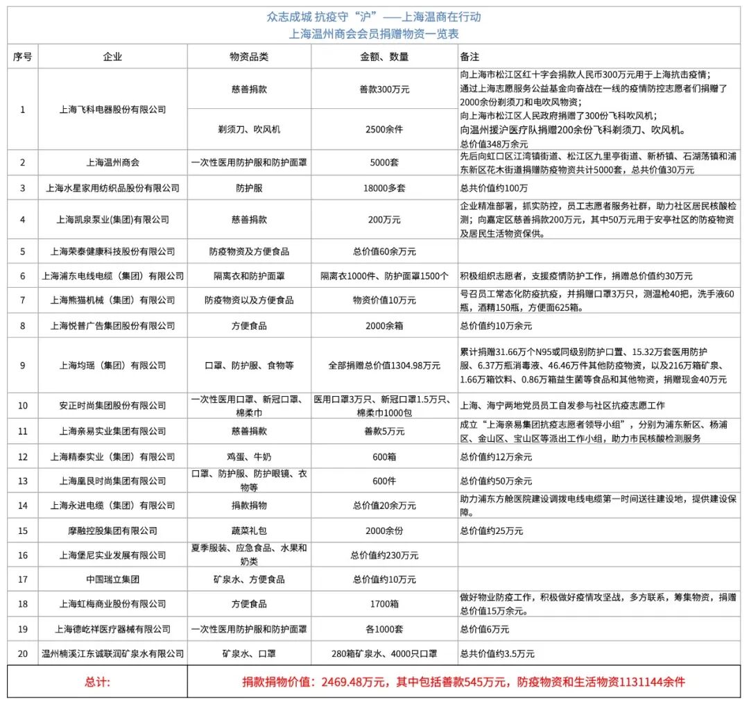 一方有难,八方支援。家是最小国,国是最大家。在沪温商们克服种种困难,用无私的奉献为抗疫前线提供了医疗保障资源,用最快的速度驰援方舱医院建设,用最大的力量保障应急生产供货,打通各方资源渠道为无数个家庭提供民生保障……截至目前,9323彩集团会员企业累计捐款捐物2469.48万元。