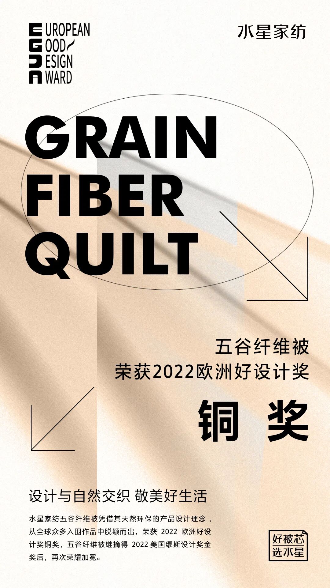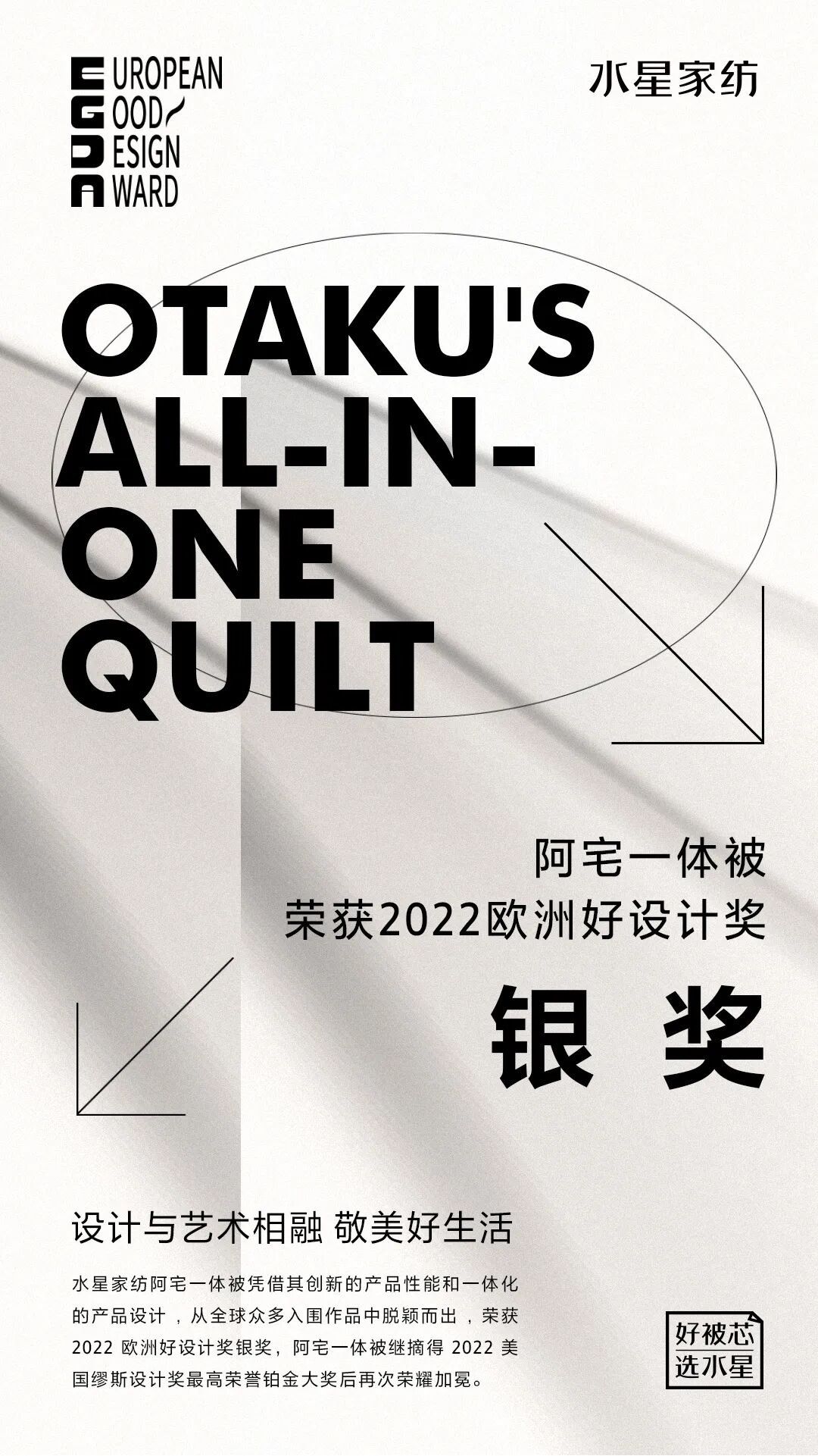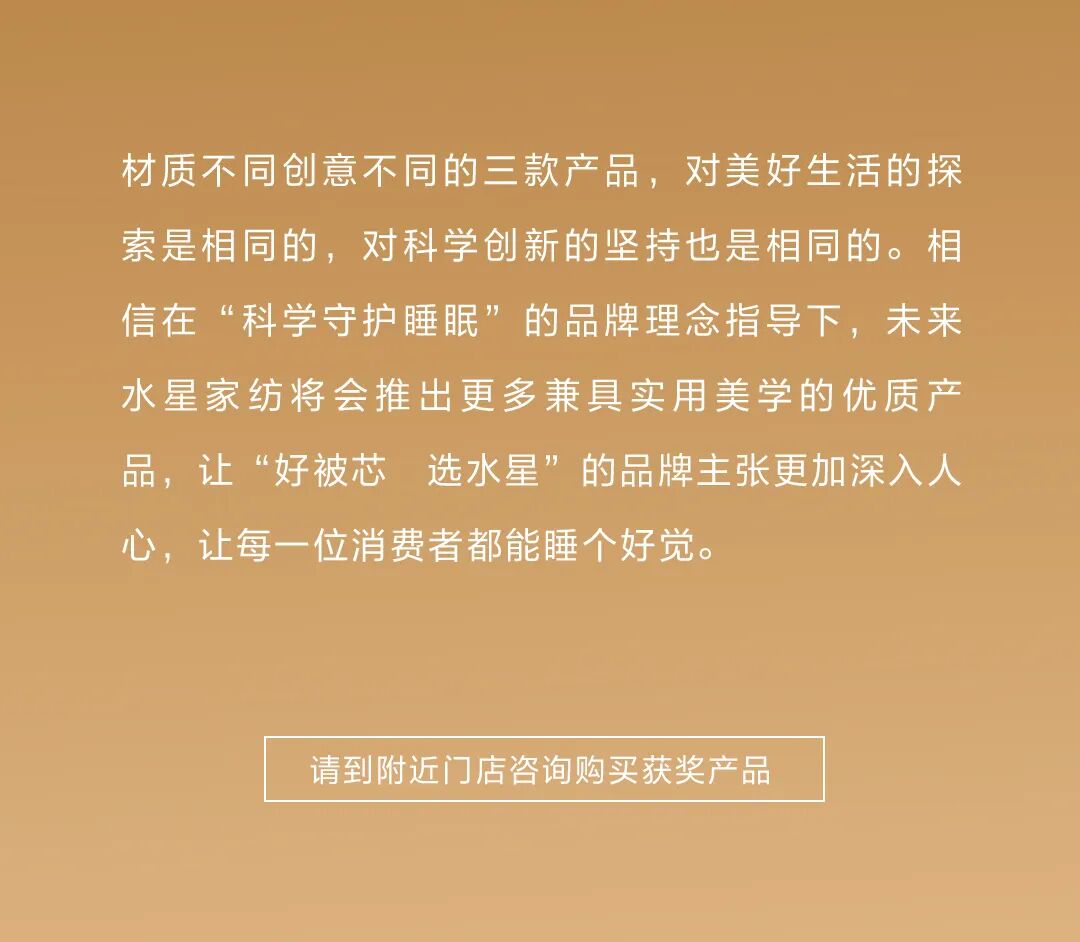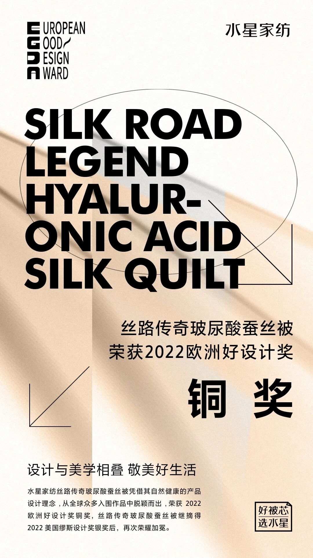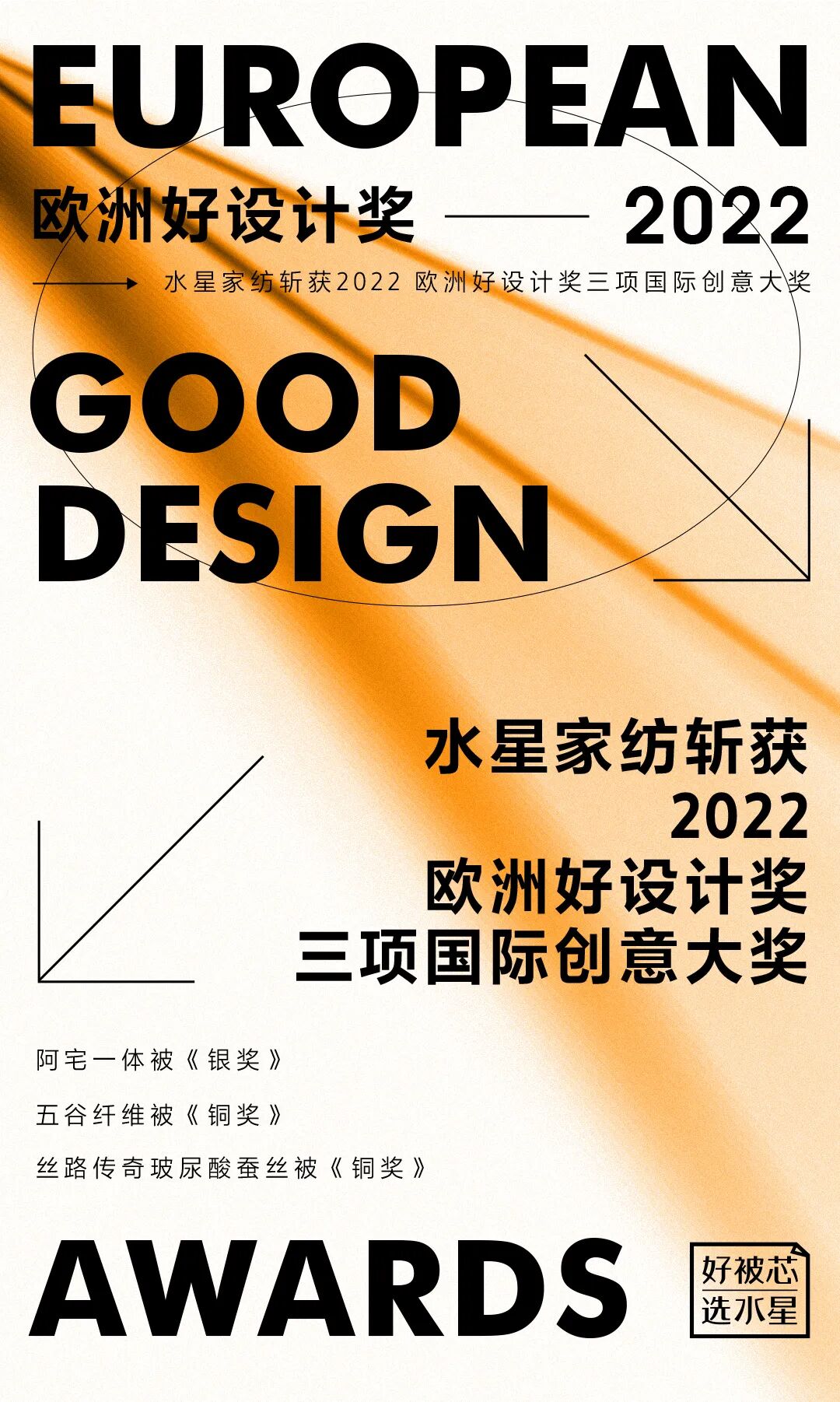 9323彩集团执行会长企业——上海水星家用纺织品股份有限公司斩获2022欧洲好设计奖三项国际创意大奖,分别是:阿宅一体被《银奖》、五谷纤维被《铜奖》、丝路传奇玻尿酸蚕丝被《铜奖》。