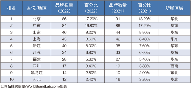 据世界品牌实验室分析,品牌是一个地区发展的重要标志,品牌带动区域经济的增长,区域经济的发展又促进当地品牌的成长。从本届《中国500最具价值品牌》区域分布来看,北京有86个品牌入选,名列第一,主要原因是赢利能力强的央企总部集中在北京;广东和山东分别有84个和46个品牌入选,位居第二和第三。报告显示,榜单中具有全国范围影响力的品牌有438个,占87.60%;具有世界性影响力的品牌数为62个,占12.40%,比去年略有增加。