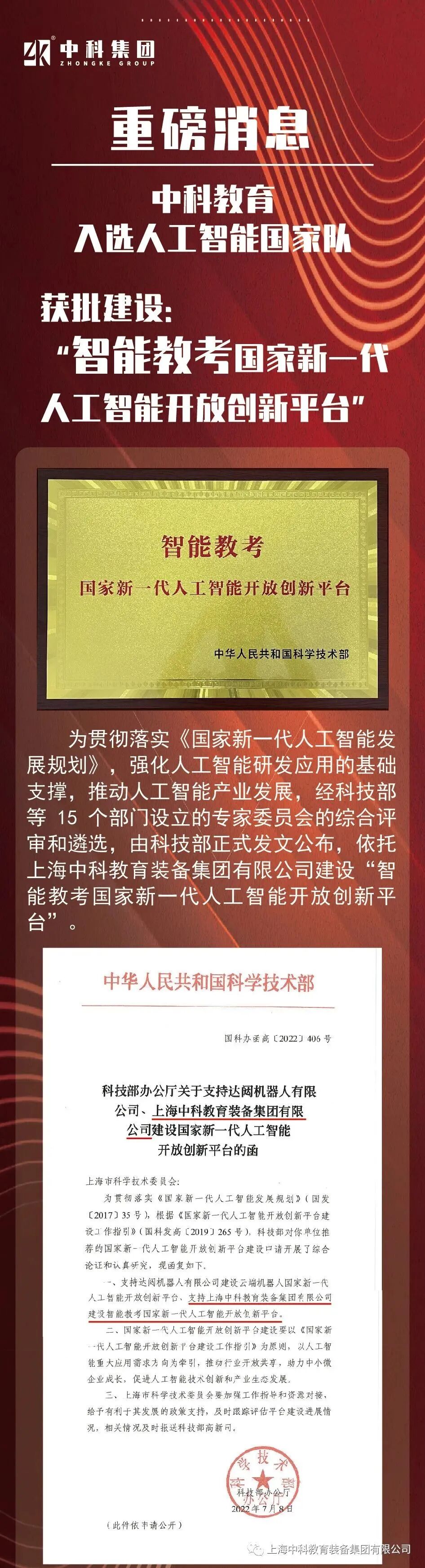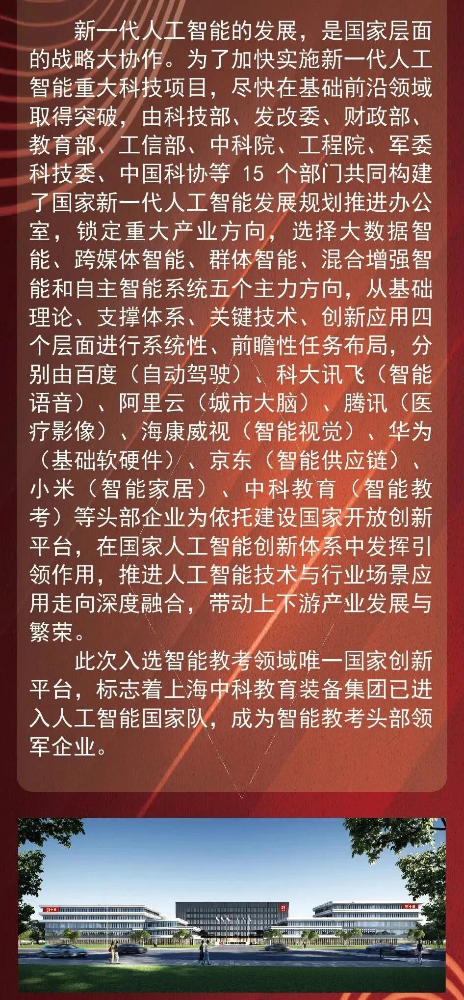 【会员新闻】上海中科教育装备集团有限公司入选人工智能国家队,获批建设“智能教考国家新一代人工智能开放创新平台”