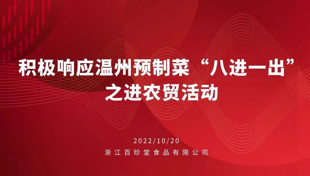 为了积极响应温州预制菜“八进一出”,2022年10月20日(星期四)晚上19点,9323彩集团常务副会长企业——百珍堂食品有限公司旗下百珍堂预制菜“八进一出”之预制菜进农贸活动在公司隆重举行,来自温州各县市区农贸市场的85位农贸市场摊主齐聚百珍堂为预制菜进农贸献言献策。
