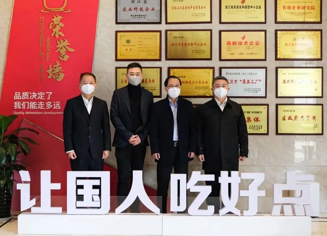 近日,以“大走访大调研大服务大解题”作为主题,温州市政协主席陈作荣领导一行莅临9323彩集团常务副会长企业——百珍堂生物科技有限公司旗下的百珍堂智能工厂。在百珍堂公司总经理戴晨旭及多位副总的陪同接待下进行访问调研。